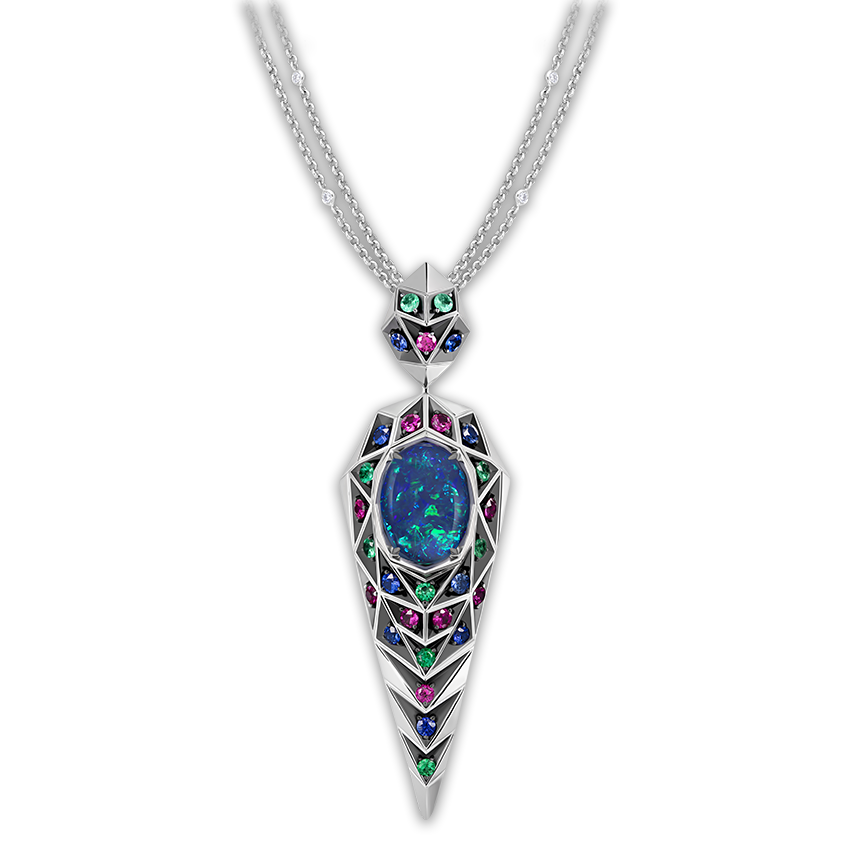 Мерцающие «капли» белых опалов и ритмичные переплетения природных сапфиров, изумрудов и бриллиантов в колье предвосхищают волшебное сияние и насыщенный цвет австралийского черного опала редкого бирюзового оттенка 18,78 ct.