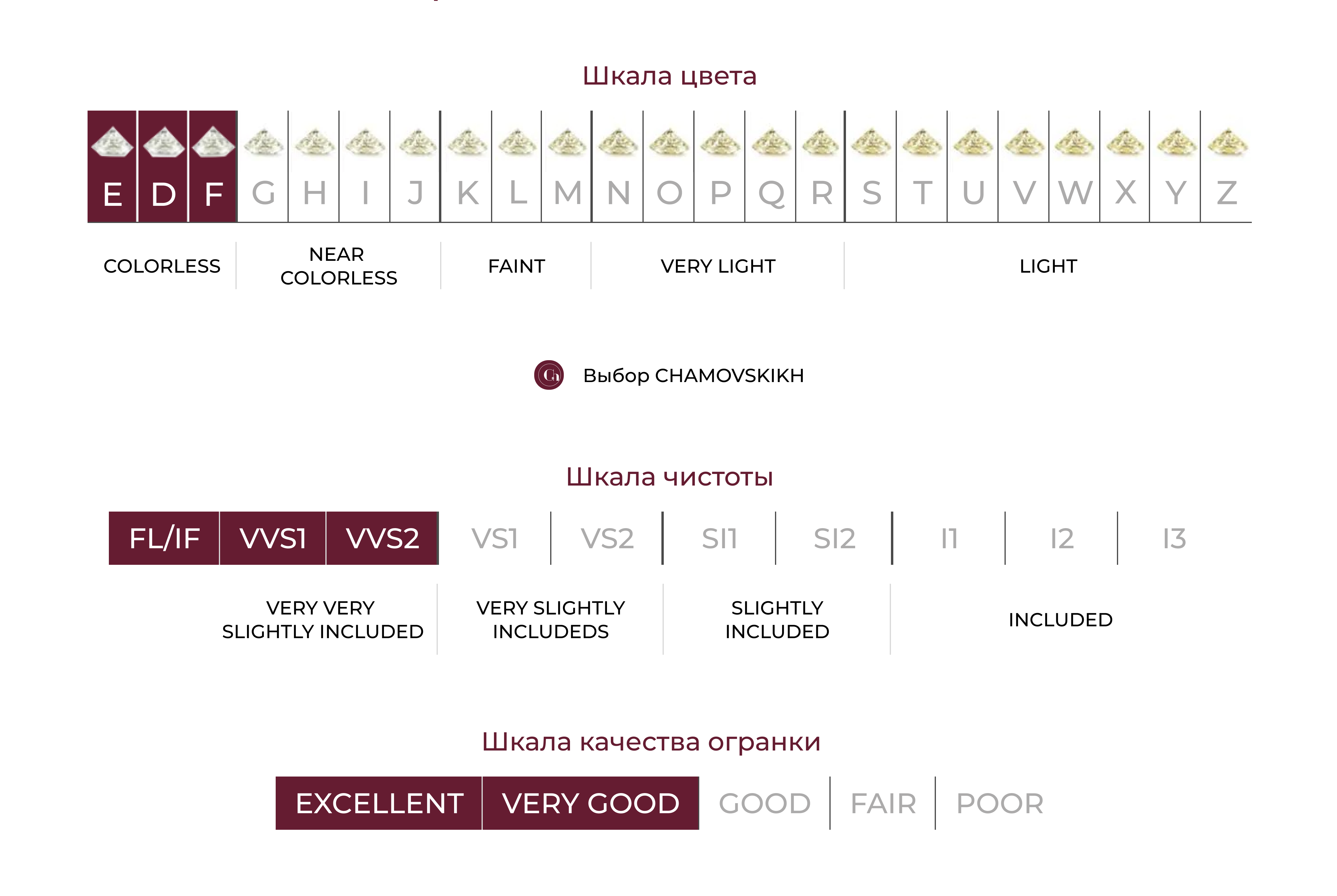 3 C − clarity (чистота). Чистота камня зависит от количества, размера, характера и расположения включений. Эксперты-геммологи Chamovskikh отбирают только самые чистые бриллианты, принадлежащие к категориям от FL (безупречные) и до VVS2 (с едва заметными включениями невидимыми невооруженным взглядом).