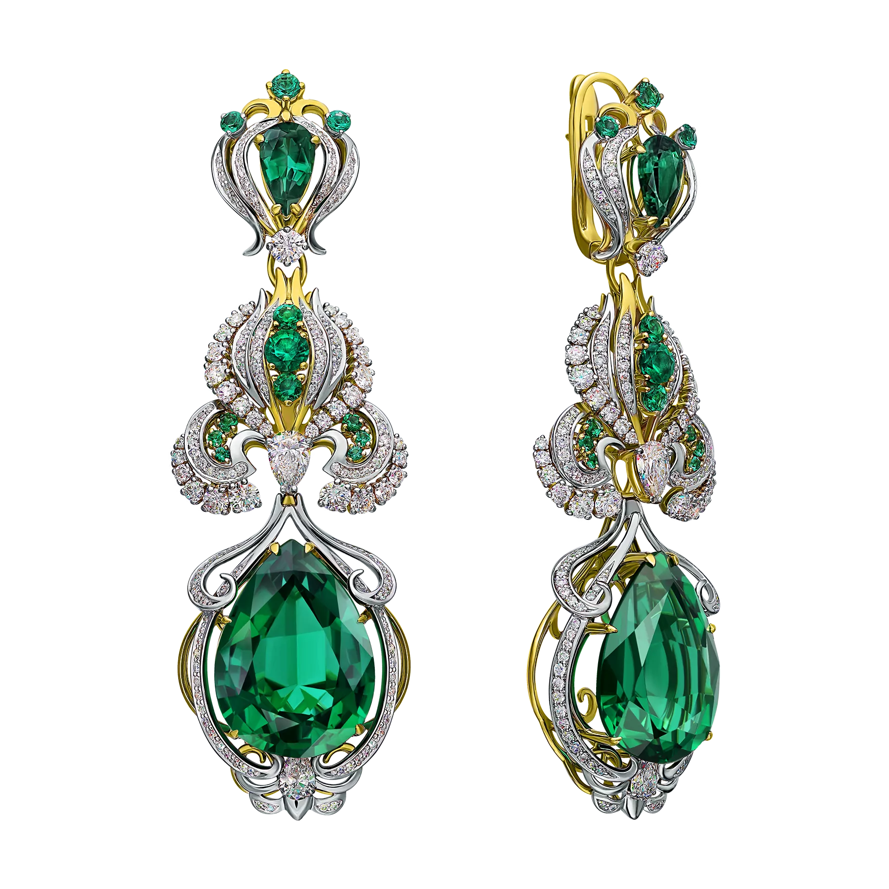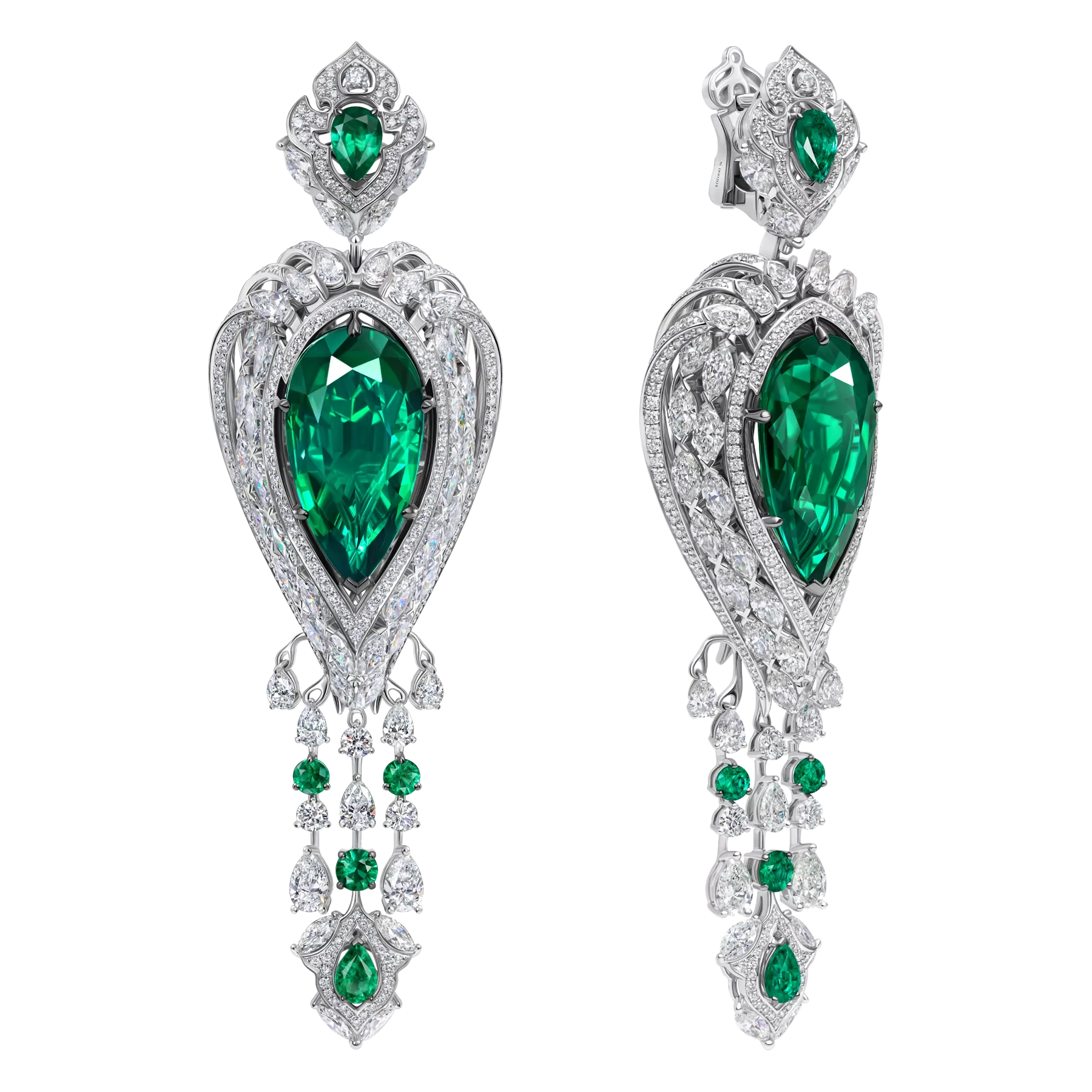 Серьги из коллекции Royal, центральный камень: 2 изумруда огранки «груша» весом 32,0 ct, инкрустация: 330 бриллианта 5,62 ct, 26 изумруда 2,85 ct.