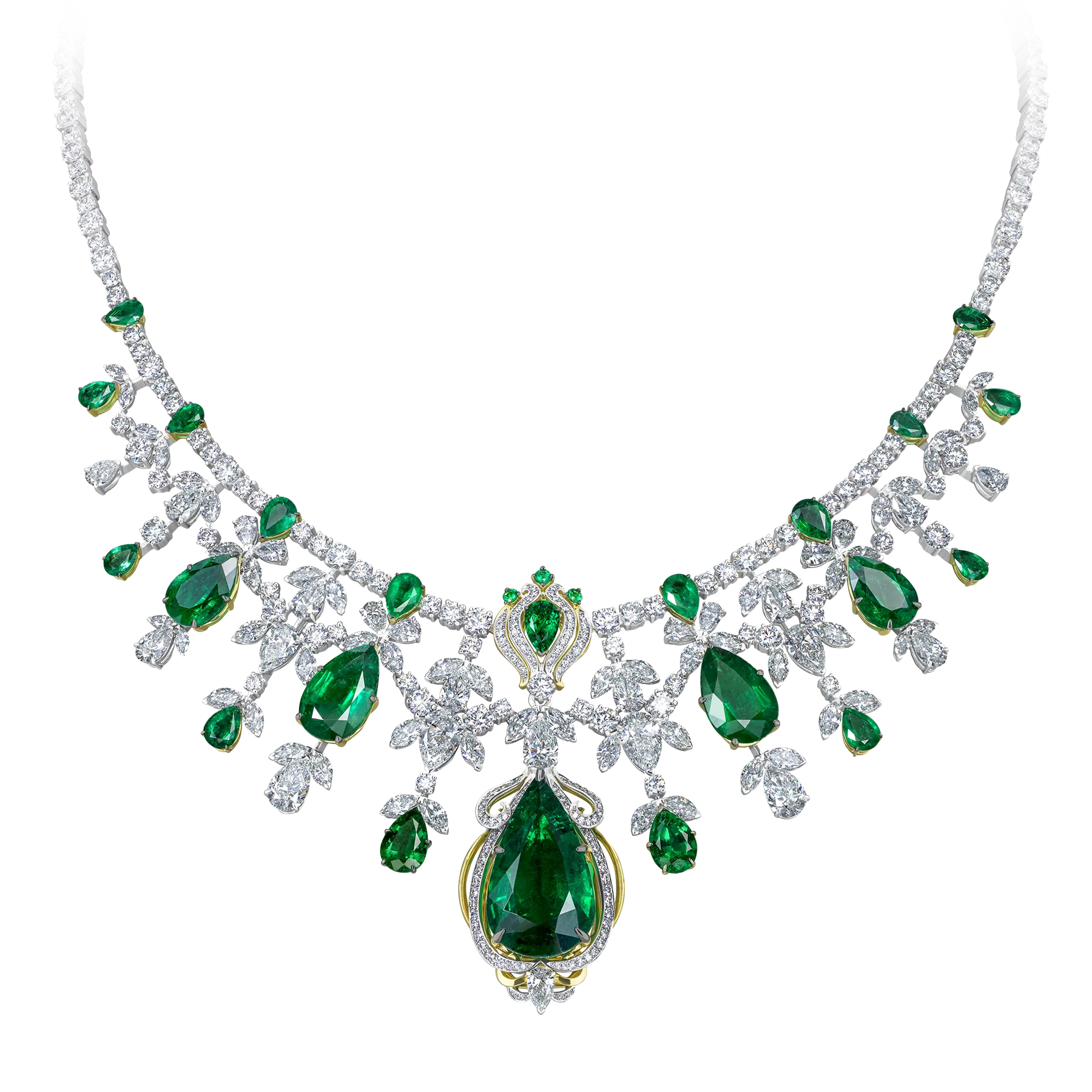 Колье из коллекции Royal, центральный камень: изумруд огранки «груша» весом 18,24 ct, инкрустация: 564 бриллианта 47,02 ct, 24 изумруда 28,64 ct.