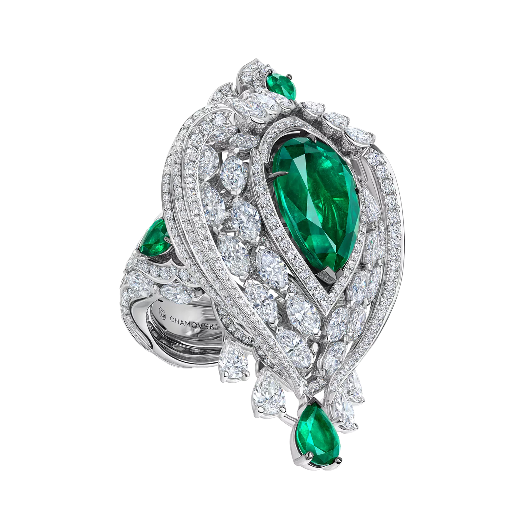 Кольцо-трансформер из коллекции Royal, центральный камень: изумруд, огранка «груша», весом 8,32 ct, инкрустация: 771 бриллиант 13,69 ct, 4 изумруда 1,53 ct