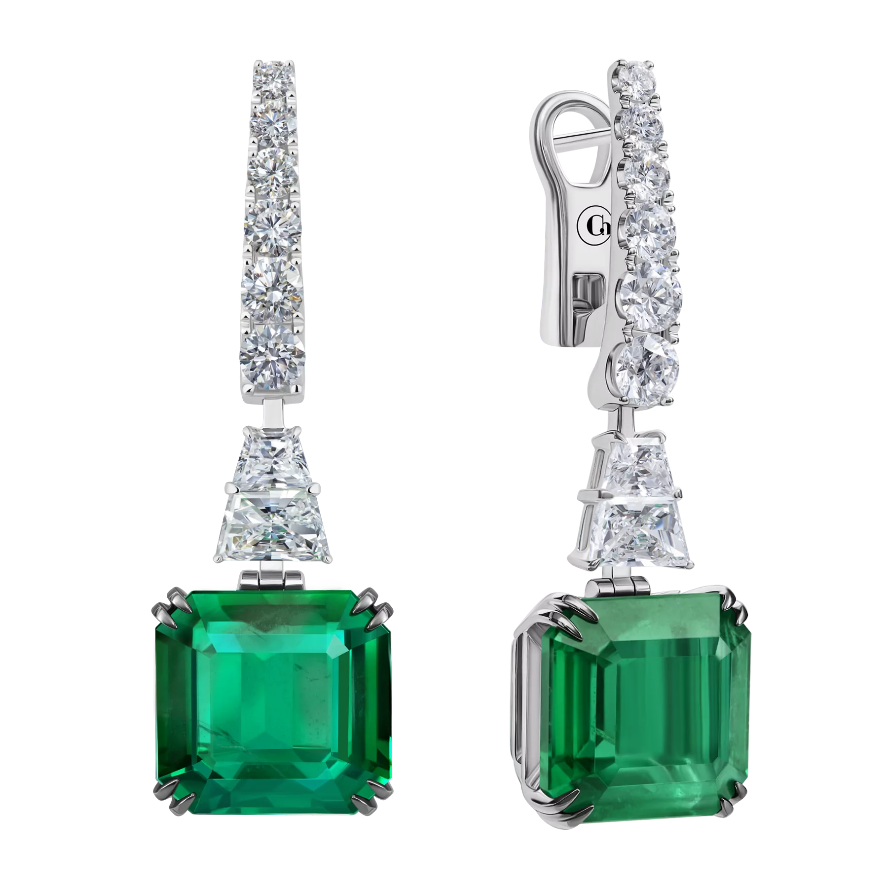 Серьги из коллекции Royal, центральный камень: 2 изумруда, огранка «октагон» общим весом 22,88 ct, инкрустация: 16 бриллиантов 3,69 ct.