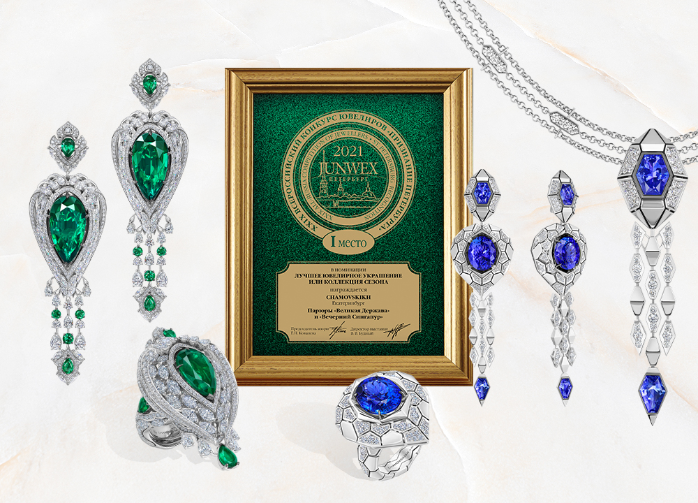CHAMOVSKIKH подтвердил многолетнее лидерство на ювелирном рынке в премиум-сегменте. Профессиональное жюри присудило ювелирному дому первое место в престижной номинации «Лучшее украшение сезона». Награду получили сразу две парюры: «Великая держава» и «Вечерний Сингапур». Экспертное жюри отметило потрясающую красоту инвестиционных камней, эффектные механизмы трансформации украшений и виртуозный уровень исполнения драгоценностей.