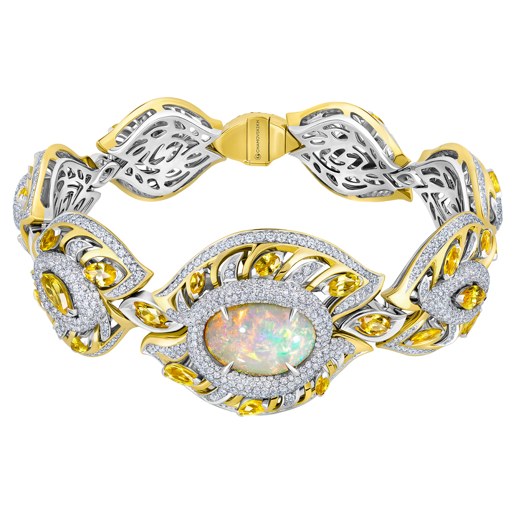 Дизайн браслета «Бруней» вдохновлен удивительной архитектурой королевской мечети Султана Омара Али Сайфуддина. Дизайнеры CHAMOVSKIKH воспроизвели восточную роскошь и шик одного из богатейших государств мира. Пламенные переливы опалов словно освещают украшение изнутри. Ажурные узоры, солнечная энергетика тысяч бриллиантов и желтых сапфиров придают ему магическое очарование.