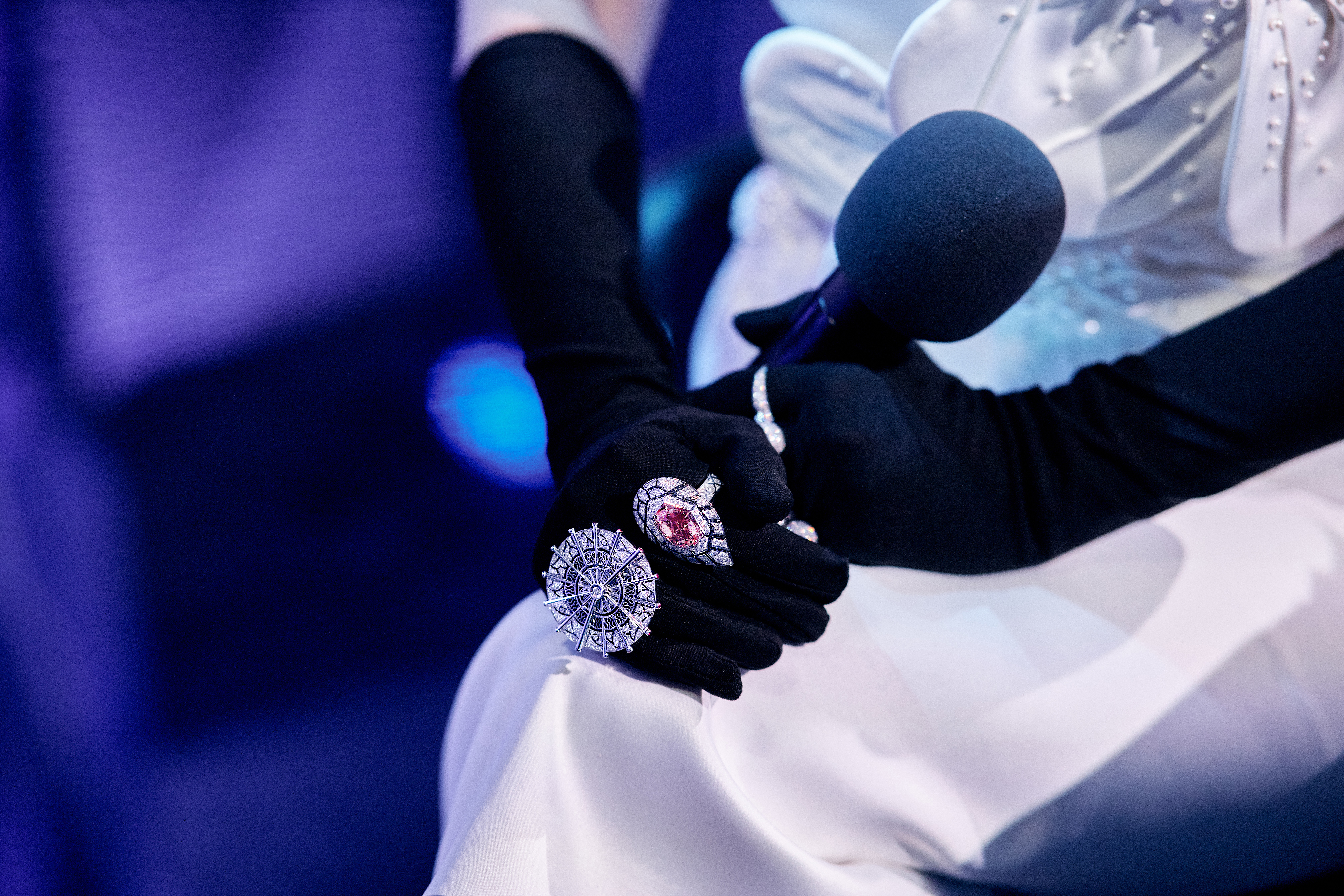 Удлиненные асимметричные серьги, пара колец и двойное колье с подвесными бриллиантовыми сферами следовали за каждым движением артистки, завораживая ослепительным сиянием 1100 драгоценных камней. Возможность трансформации украшений позволила импровизировать с длиной золотых цепей и высотой расположения подвесных элементов. В дополнение к драгоценностям Jazz Age Валерия выбрала коктейльное кольцо «Дневной Сингапур» с бриллиантами и коллекционным морганитом, а также кольцо из концептуальной коллекции «Искусство флирта».