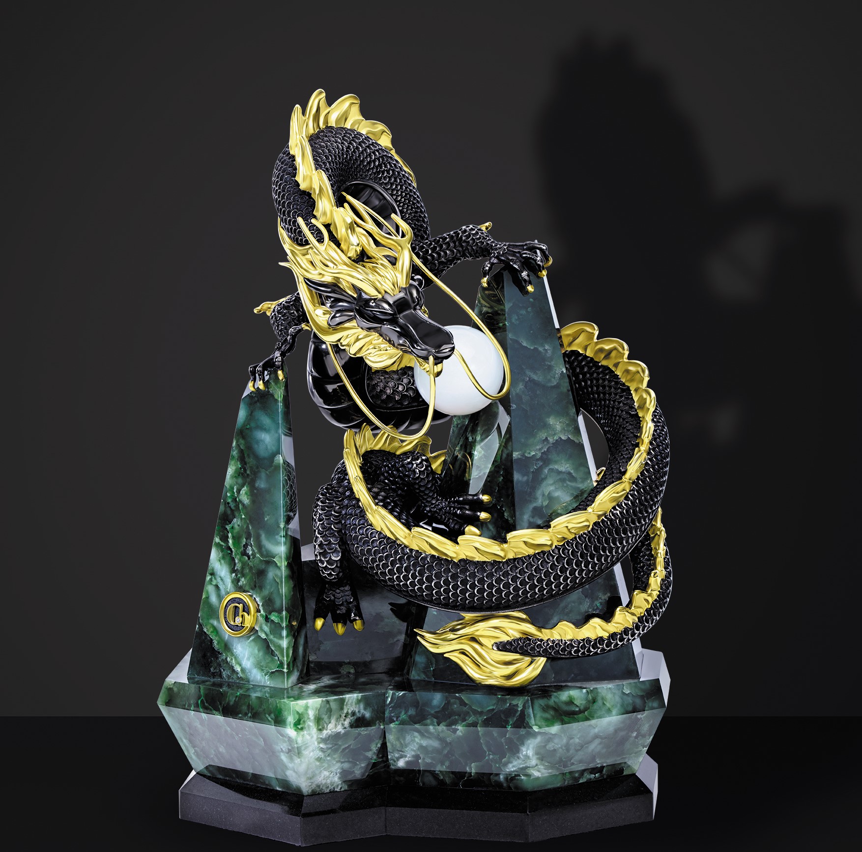 Пластика серебряного «Дракона» передает его огромную внутреннюю энергию. Детально проработанная фактура чешуи, а также покрытые чистым золотом рога, когти и гребень эффектно отражаются на полированной поверхности нефрита — священного для Китая, Тибета и других азиатских стран минерала. Сложный объем камня ассоциируются с горами, где обитает бессмертный дракон и хранится его заповедная жемчужина.
